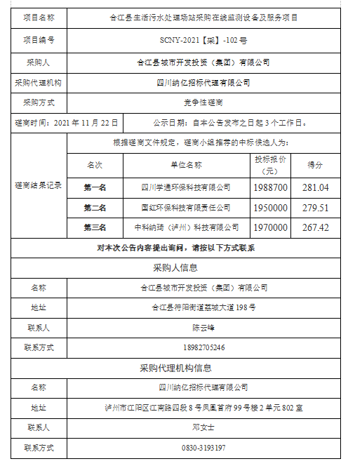 合江縣生活污水處理場站采購在線監(jiān)測設(shè)備及服務(wù)項(xiàng)目競爭性磋商結(jié)果公告